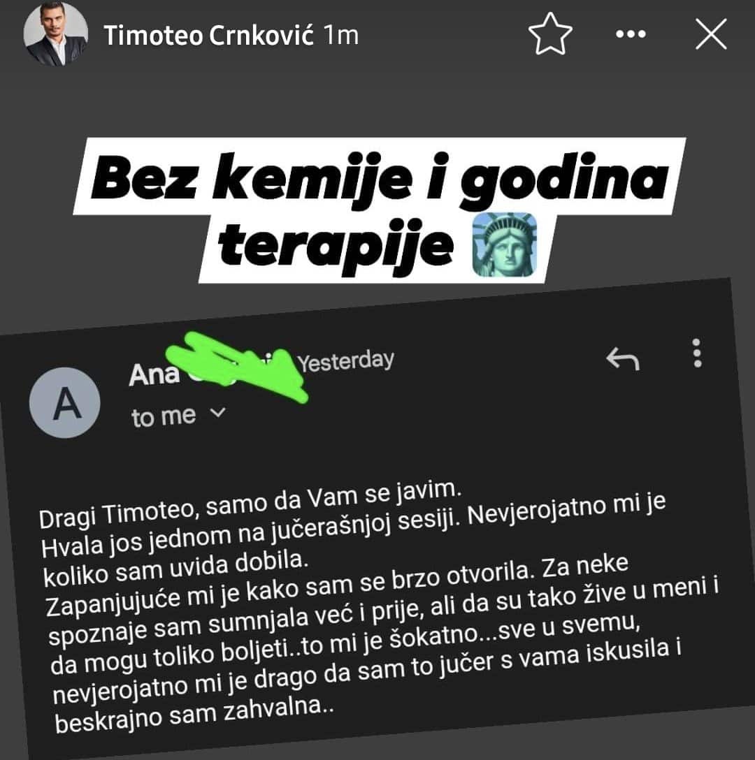 Timoteo Crnković je međunarodno diplomirani napredni Ericksonov hipnoterapeut specijaliziran za anksiozne poremećaje i ovisnosti. Njegov individualizirani pristup fokusira se isključivo na rezutat te kombinira izuzetno napredan oblik hipnoterapije, rekurzivno kognitivno reprocuesuiranje i elemente RTT terapija, pružajući brzo i trajno rješenje izvora stvarnih problema. Jedan je od rijetkih terapeuta u svijetu koji je imao čast učiti izravno iz linije znanja Dr. Miltona Ericksona – jednog od najvećih stručnjaka za mentalno zdravlje 20. stoljeća.
